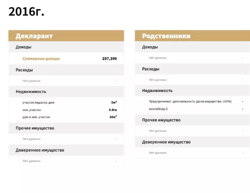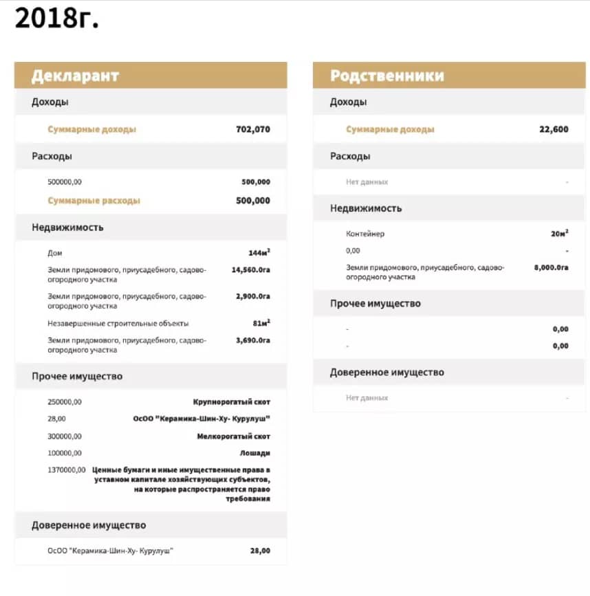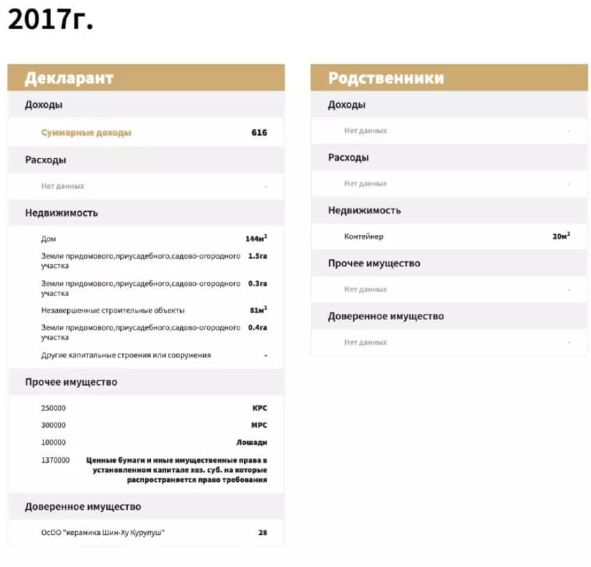 В числе имущества в 2015-2016 годах чиновник указывал два земельных участка и недостроенный дом с участком. В 2015-м Абдыжапар Бекматов отметил в ЕНД, что есть доля 18 процентов в ОсОО, но только в одном и без указания названия. «Только в 2017-2018 годах он начал указывать в числе прочего имущества долю в ОсОО «Керамика Шин-Ху Курулуш» в размере 28 процентов. Однако в регистрационных документах этой фирмы по производству строительных металлических конструкций в числе учредителей нет Абдыжапара Гапыровича Бекматова. Но есть Кылымбек Ахматалиевич Гапыров и доля иностранного участия в лице Ли Хуибиао», — отмечается на сайте.