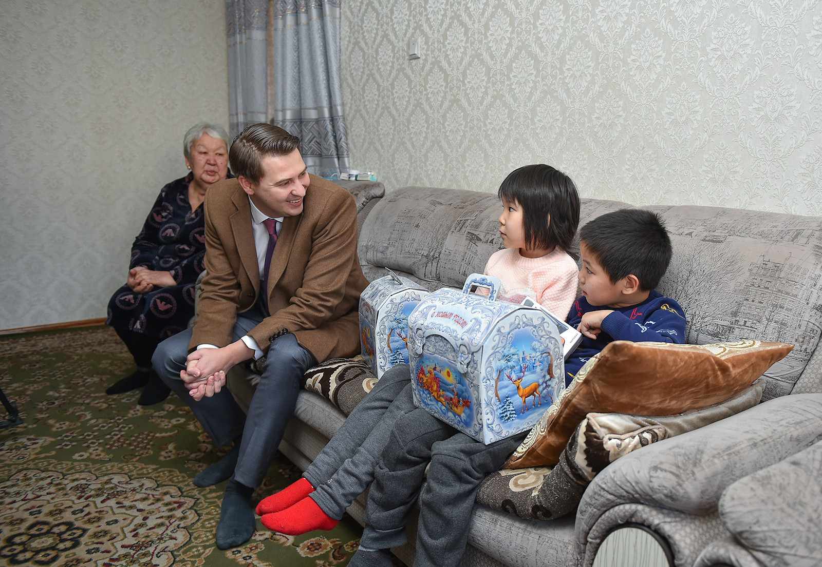 И. о. главы кабмина поздравил детей с наступающим Новым годом и вручил им подарки. Брат и сестра остались без матери сразу после родов, спустя полгода в автомобильной аварии погиб их отец. Сейчас опекуном детей является бабушка по маминой линии Кымбат Сарбашева.