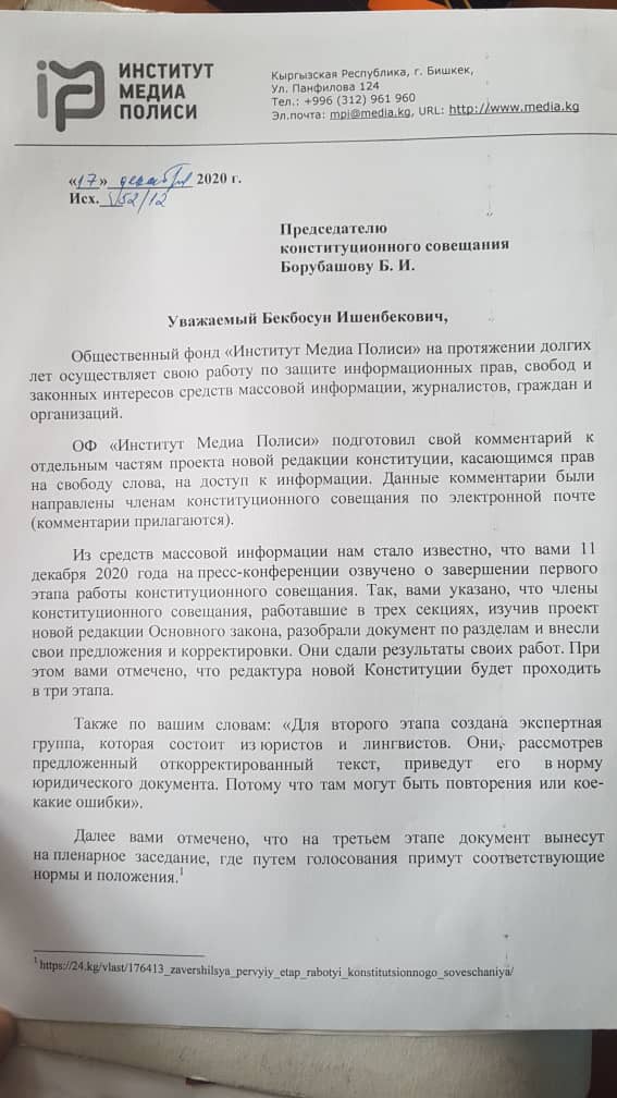 Юристы попросили предоставить проект Конституции для ОФ «Институт Медиа Полиси» и опубликовать его текст на сайте Жогорку Кенеша и в СМИ.