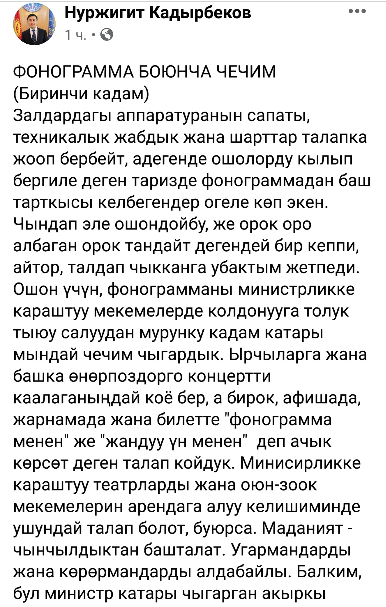 «Очень много было тех, кто не хотел отказываться от фонограммы. Говорили, что, прежде чем принимать этот закон, нам нужно улучшить аппаратуру в залах, техническое оснащение. Говорили, что они не отвечают современным требованиям. У меня не хватило времени выяснять, действительно ли так, или это удел тех, кто не умеет петь вживую. Поэтому мы обязали их предупреждать зрителей о фонограмме. Культура начинается с честности. Давайте не будем обманывать зрителей и слушателей», — написал министр Нуржигит Кадырбеков на своей странице в Facebook.