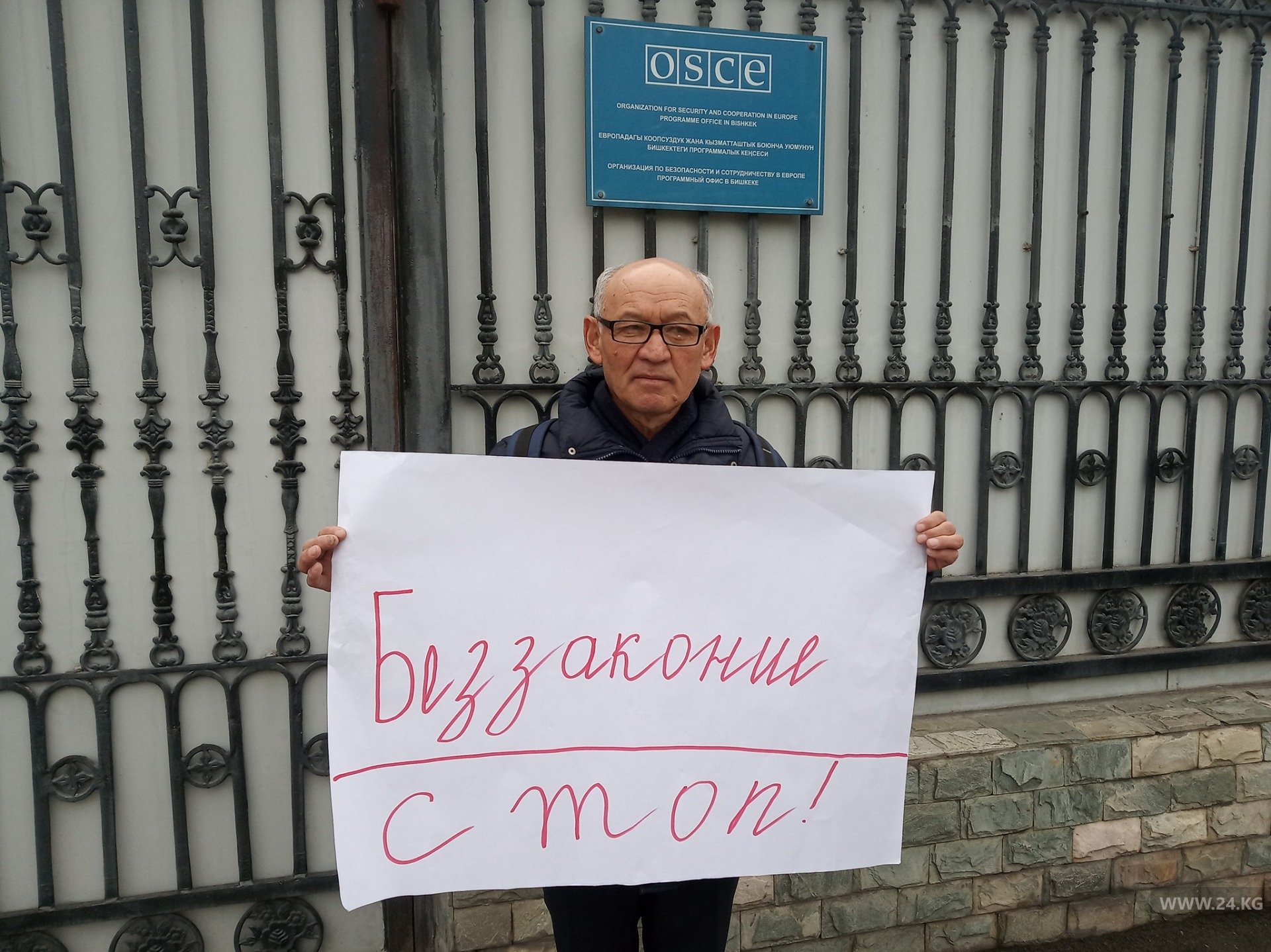 В Бишкеке у офиса Организации по безопасности и сотрудничеству в Европе (ОБСЕ) гражданский активист Ондуруш Токтонасыров провел одиночный пикет против изменения Конституции. Об этом правозащитник написал на своей странице в Facebook.