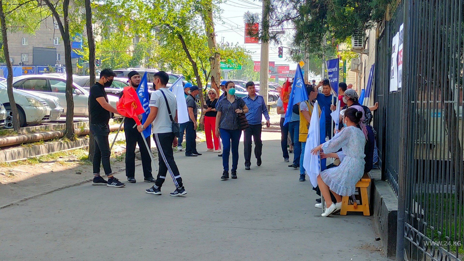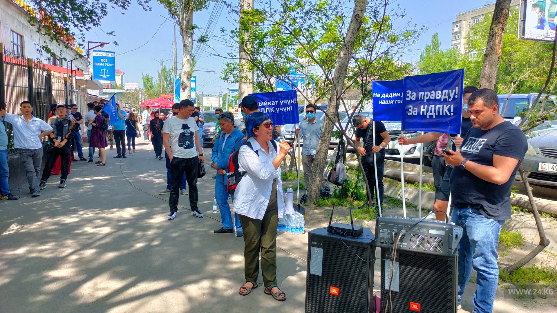 Сторонники партии НДПК второй день митингуют у здания административного суда Бишкека. Там рассматривается жалоба политобъединения на решение ЦИК об отмене регистрации списка кандидатов НДПК и признании бюллетеней с голосами избирателей, поданными за партию, недействительными.