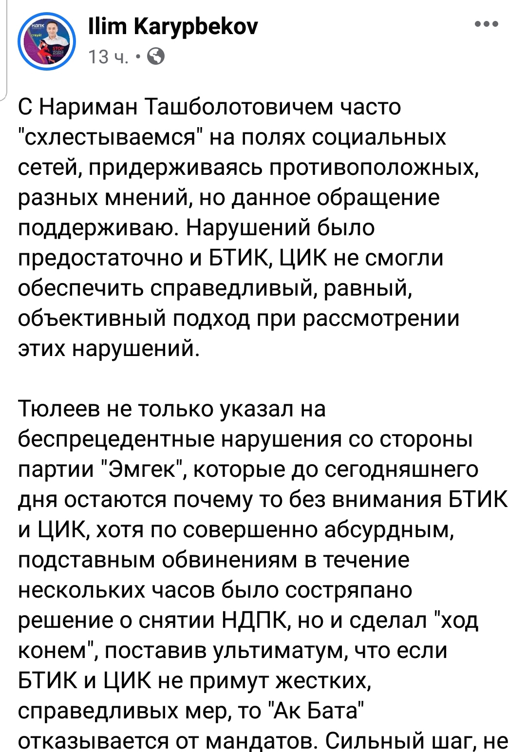«Тюлеев не только указал на беспрецедентные нарушения со стороны партии «Эмгек», которые до сегодняшнего дня остаются почему-то без внимания БТИК и ЦИК, хотя по совершенно абсурдным обвинениям в течение нескольких часов состряпали решение о снятии НДПК, но и сделал «ход конем», поставив ультиматум, что если БТИК и ЦИК не примут жестких, справедливых мер, то «Ак Бата» отказывается от мандатов. Сильный шаг, не оставляющий выбора БТИК и ЦИК, кроме как назначить повторные выборы. Ну что ж. Остается только выразить уважение мужскому характеру Тюлеева и пожелать БТИК и ЦИК сохранить лицо и настоящие откровенные нарушения, которые поступили к ним на рассмотрение, а не только подставные и заказные для отвода глаз по партии НДПК», — написал Илим Карыпбеков.