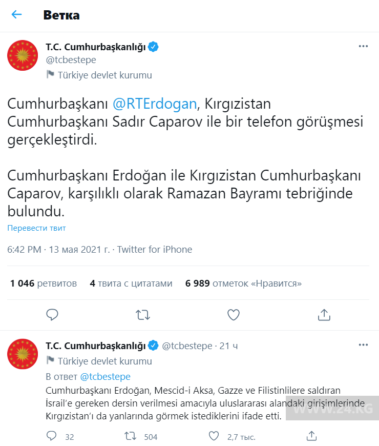 «Президент Эрдоган заявил, что он хочет видеть Кыргызстан в своих международных инициативах, чтобы преподать необходимый урок Израилю, который атакует мечеть Аль-Акса, Газу и палестинцев», — говорится в опубликованном твите.