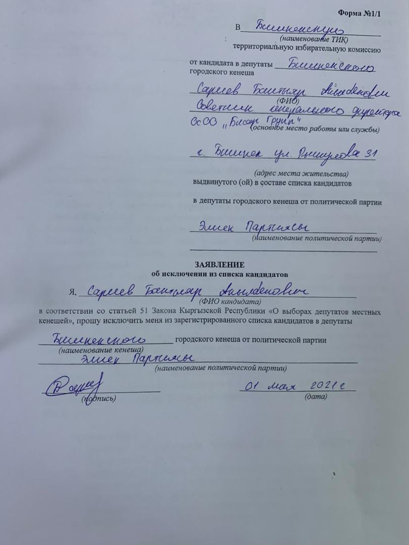 «Бактыяр Сариев 1 мая подал заявление об исключении его из списка кандидатов», — сообщили в партии.