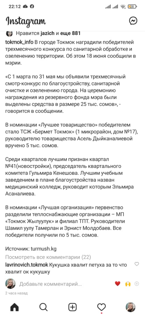 Он сообщил: якобы на странице tokmok_info социальной сети Instagram размещена информация о том, что в мэрии Токмака прошло награждение победителей конкурса по санитарной обработке и озеленению территории.