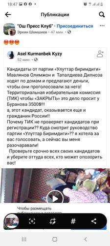 Кроме этого, указано, что со стороны «Улуттар биримдиги» якобы была попытка дать взятку в размере $3,5 тысячи члену Ошской территориальной избирательной комиссии, чтобы не реагировал на сигналы о нарушениях.