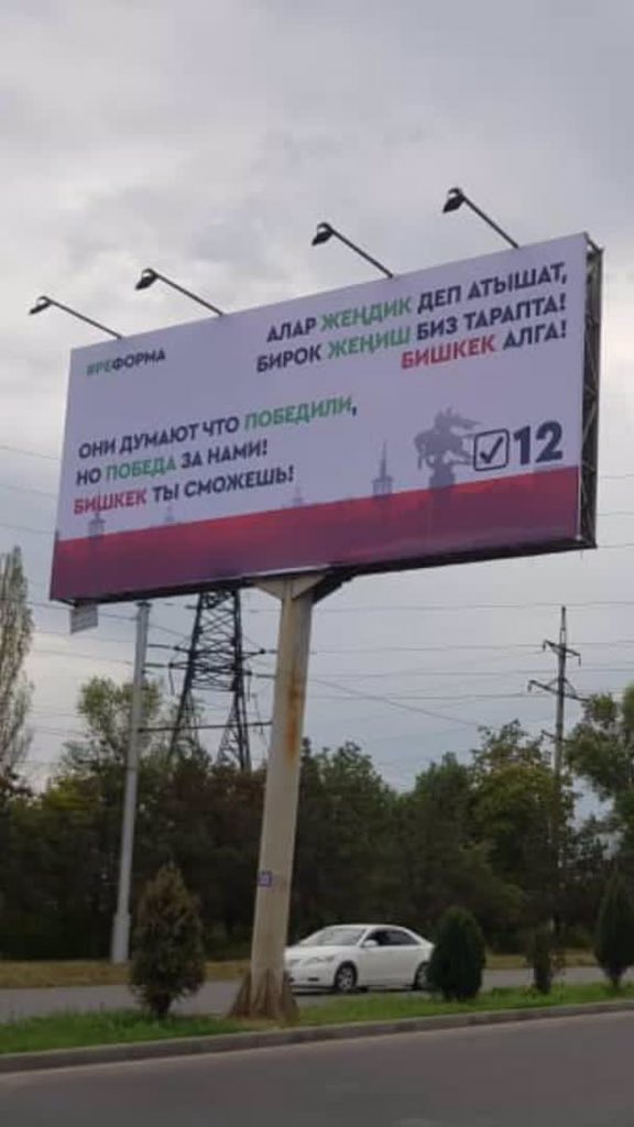Реформисты, как и в прошлые кампании, проводят агитацию в соцсетях. На рекламу в СМИ партия традиционно не тратится. Главный посыл — «Бишкеку нужна реформа». Встречи с избирателями партийцы организовывают преимущественно в городских парках и скверах. Предлагают случайным прохожим сыграть в шахматы. В ходе этой кампании «Реформа» все-таки установила билборд.