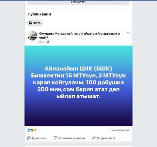 Он написал, что председатели МТУ № 15 и МТУ № 3 подкупают избирателей. В публикации говорится, что за 100 голосов избирателей предлагают по 250 тысяч сомов, то есть каждый голос стоит 2 тысячи 500 сомов.