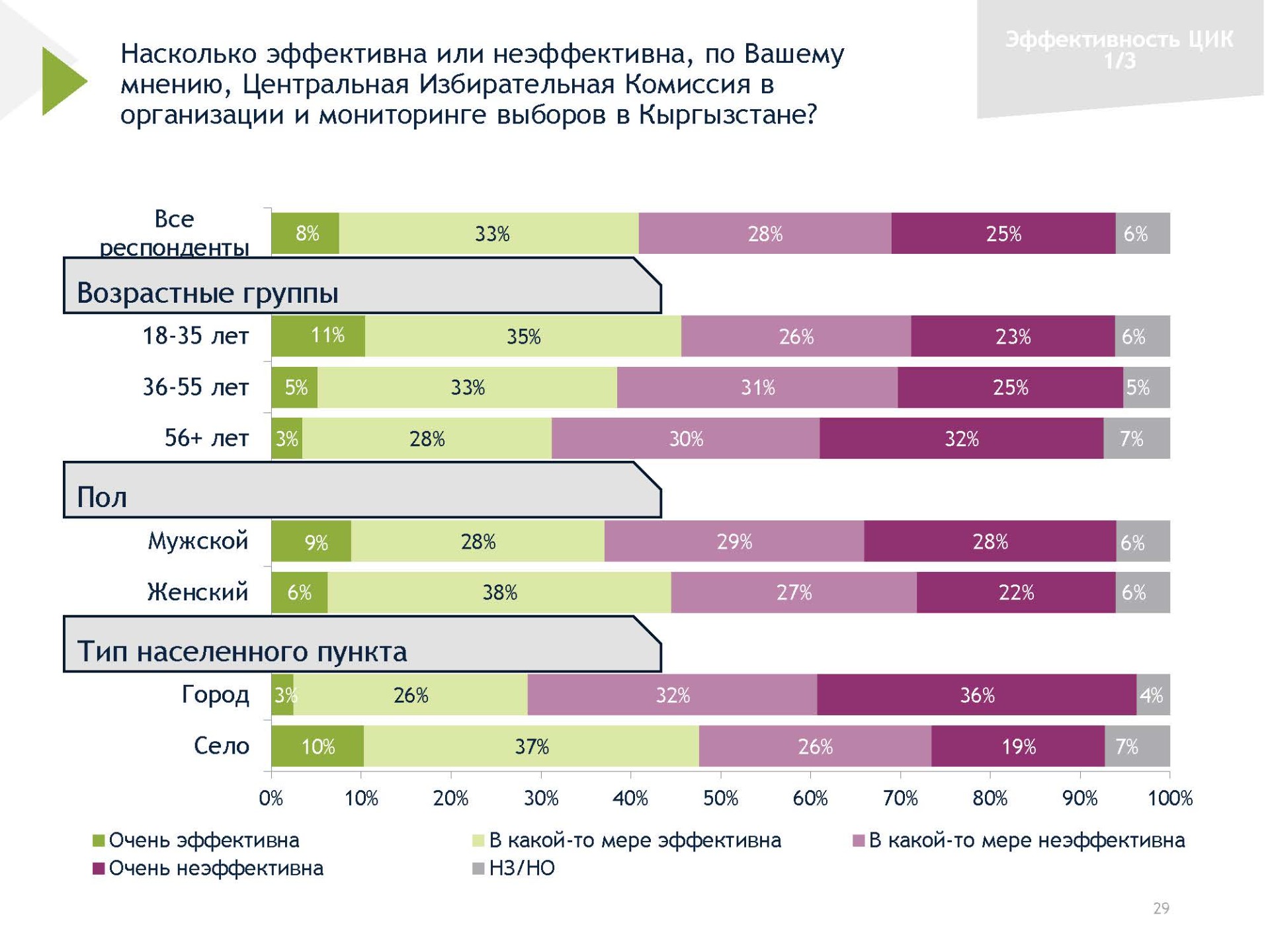 33 процента из числа опрошенных отмечают, что Центризбирком достаточно эффективен. 28 процентов ответили, что ЦИК в какой-то мере неэффективна, и 25 процентов оценили деятельность Центральной избирательной комиссии как совершенно неэффективную.