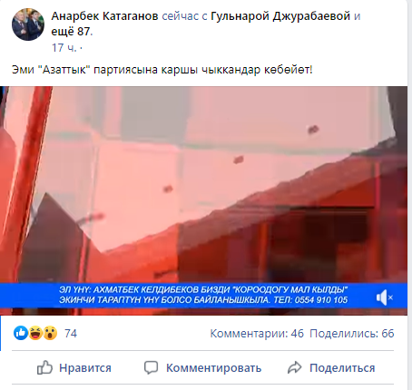 «Рабочая группа ЦИК затягивает слушание по партии «Азаттык». Первое слушание было во вторник, 19 октября, рассмотрение затягивается. Сегодня уже неделя, как я жду уведомления. Если у партии нет доказательств, это не значит, что я об этом забыл. Рабочая группа ЦИК, может, вы желаете принять решение после выборов? Давайте соблюдать все нормы», — требует Анарбек Катаганов.