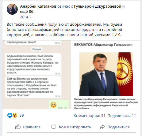 Гражданский активист Анарбек Катаганов обвиняет ЦИК в предвзятости и лоббировании интересов определенных политических групп. Об этом он написал на своей странице в Facebook.