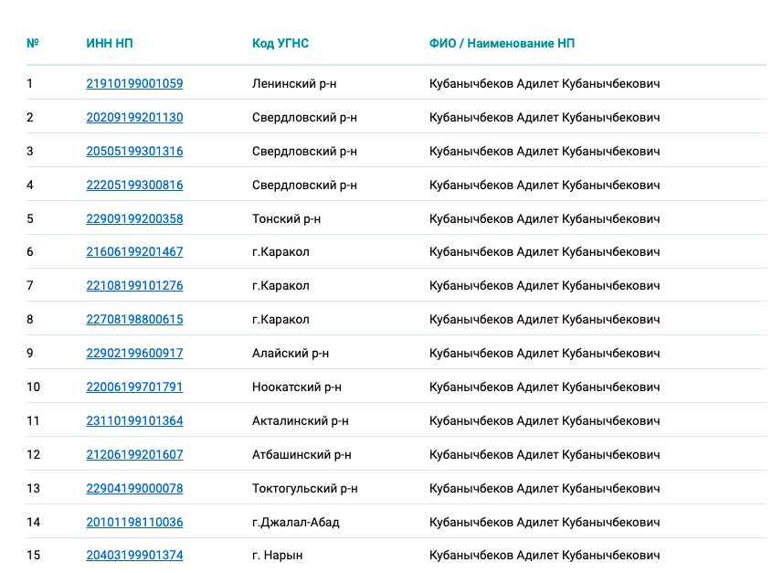 У нового председателя Гостаможенной службы как минимум 25 полных тезок. По крайней мере именно столько Кубанычбековых Адилетов Кубанычбековичей зарегистрировано в списке избирателей на портале https://tizme.gov.kg.