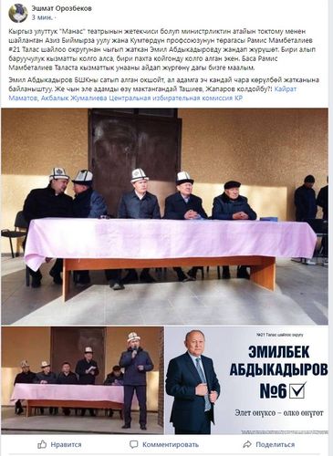 Пользователь Эшмат Орозбеков указал, что, по некоторым данным, Рамис Мамбеталиев ездит по городу Таласу на служебном автомобиле. На фото, прикрепленном к публикации, Азиз Биймырза держит микрофон, а Рамис Мамбеталиев сидит за столом рядом с кандидатом в депутаты.