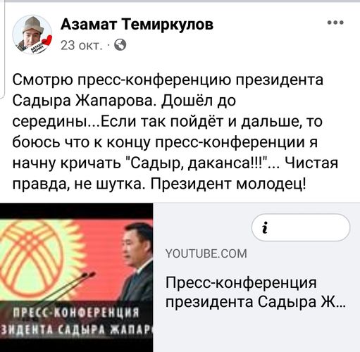 «Смотрю пресс-конференцию президента Садыра Жапарова. Дошел до середины... Если так пойдет и дальше, то боюсь, что к концу пресс-конференции я начну кричать: «Садыр, даканса!!!» Чистая правда, не шутка. Президент молодец!» — написал он.