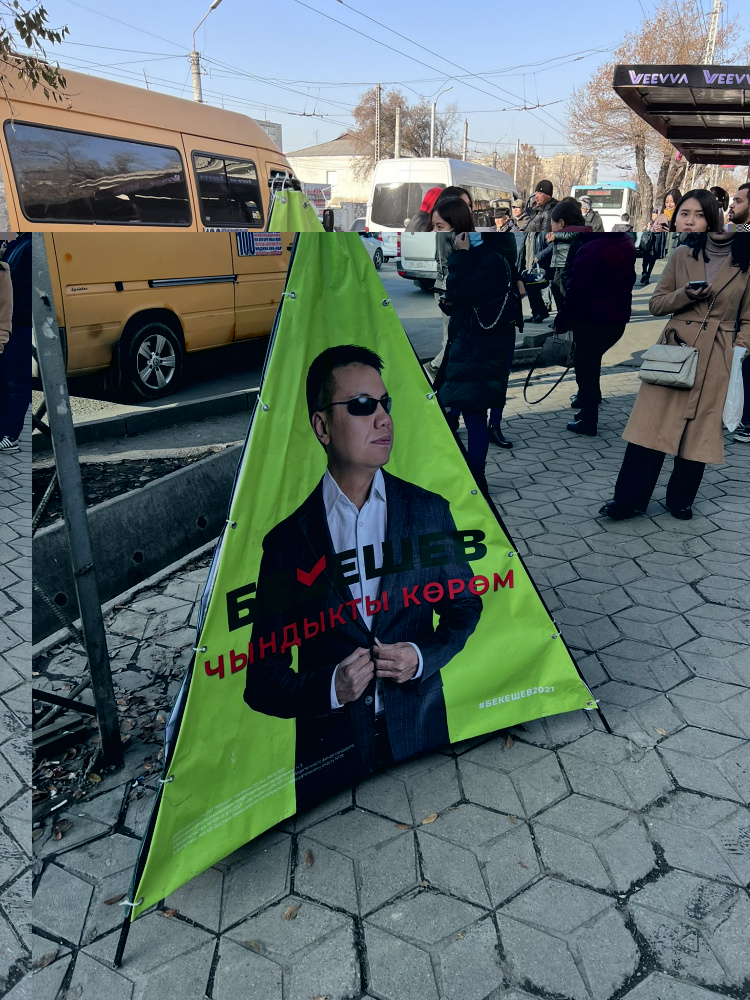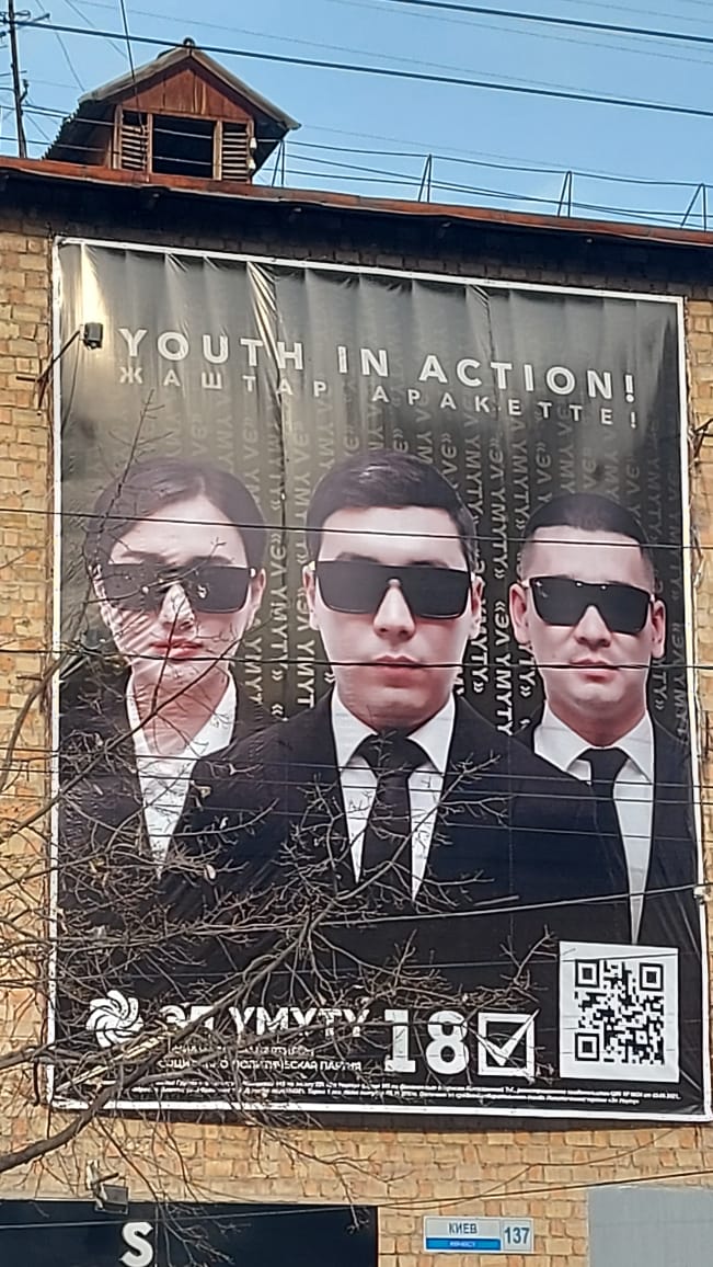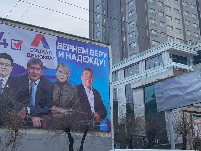Есть баннеры и у партии детей бывшего президента Алмазбека Атамбаева «Социал-демократы». Но незамысловатые. На растяжке сам Атамбаев, хотя он на выборы не идет. Рядом с ним верная соратница Ирина Карамушкина. Оба проходят фигурантами уголовного дела о событиях в Кой-Таше 7-8 августа 2019 года. На этом же баннере Темирлан Султанбеков. В списке его, как и Атамбаева, нет. Баллотироваться Султанбекову не позволяет возраст. Ему не исполнилось 25 лет.