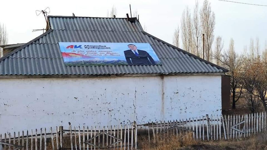 На крыше дома разместил билборд кандидат в депутаты по Кочкорскому избирательному округу № 32 Автандил Кулбараков. К слову, он считается одним из богатейших людей в стране. Странно, что не нашел более подходящего места для рекламы.