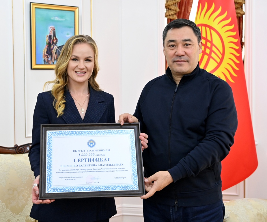 «Садыр Жапаров отметил, что для всех кыргызстанцев приезд Валентины — это радостное событие, так как вся страна болеет за ее успехи и следит за спортивной карьерой. Глава государства вручил ей денежный сертификат на 1 миллион сомов, а также памятные подарки для ее тренера Павла Федотова и матери Елены Шевченко», — сказали в пресс-службе.