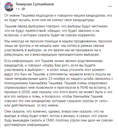 «От имени Ташиева подходили и говорили нашим кандидатам, что их будут мучать, если они не снимут свои кандидатуры... Есть информация, что Ташиев лично звонил родственникам кандидатов, и говорил: «порву Вам рот, если вы будете участвовать в выборах». Я хотел лишь уточнить этот момент. Вдруг это был не Ташиев, а оппоненты. 23 ноября из нашего штаба связались с помощниками Камчыбека Ташиева, Ташиев очень оперативно отреагировал, мне позвонили и пригласили в ГКНБ на встречу. Я приехал в 20:00, мне сказали, что этого всего не может быть, и что все это чепуха и ложь. Я попросил, чтобы Камчыбек Ташиев озвучил это сам кандидатам, которые слышали угрозы от «него» или действительно от его имени», — написал Темирлан Султанбеков.