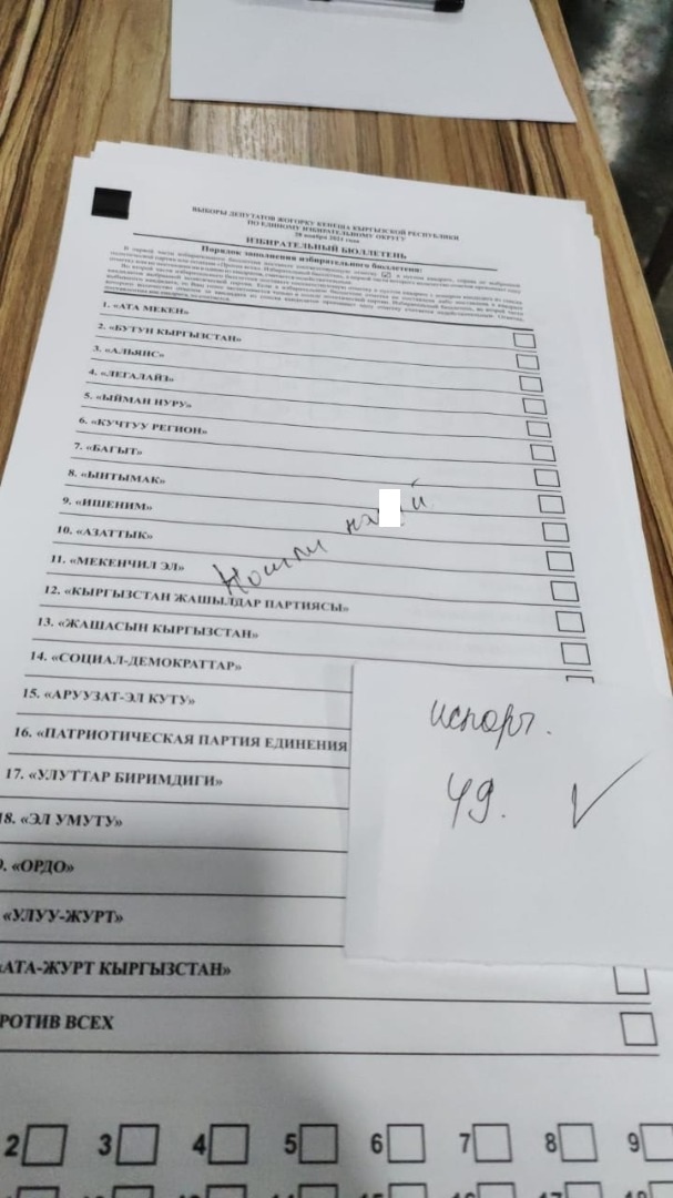 На кадрах видно, что избиратели написали на них нецензурные слова. Еще на одном под списком партий написали имя Асылбека Жээнбекова, правда, с ошибкой.