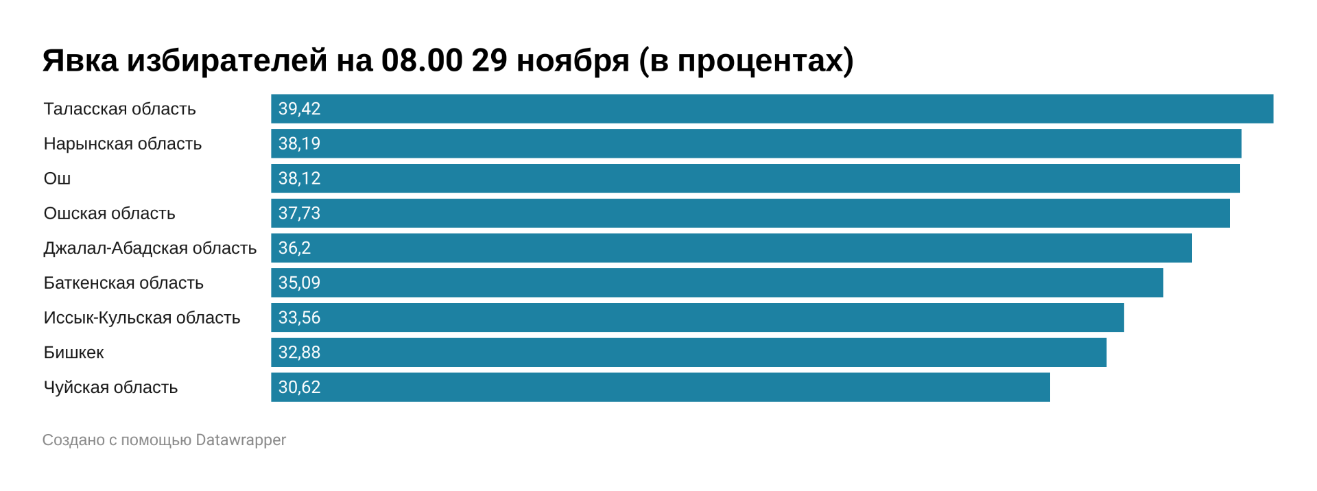 На 8.00 29 ноября на выборах депутатов Жогорку Кенеша по единому округу проголосовали 34,39 процента избирателей. Такие уточненные данные приводит Центризбирком.