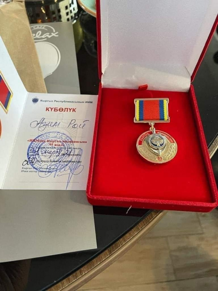 Добавим, что 95-летие кыргызской милиции отмечалось в ноябре 2019-го. Медаль вручают действующим или бывшим сотрудникам милиции Кыргызстана или Киргизской ССР. Известно, что настоящее имя Азима Роя — Орозахун Сайдазимов, ранее он действительно служил в рядах кыргызской милиции.
