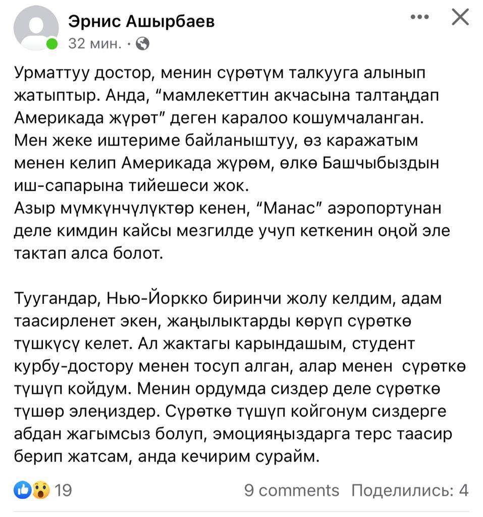 Прочитавшие этот пост поддержали возмущение активиста. В свою очередь помощник главы государства Эрнис Ашырбаев, который присутствует на снимке, на своей странице Facebook написал, что приехал в Нью-Йорк по личным делам.«Моя фотография широко обсуждается в Сети. Дополнили очернением, говоря, что на бюджетные деньги я развлекаюсь в Америке. Приехал сюда по личным делам. Поездка не связана с рабочим визитом главы государства в Нью-Йорк. Можно легко вычислить, кто и во сколько вылетел из аэропорта «Манас», — написал Эрнис Ашырбаев.