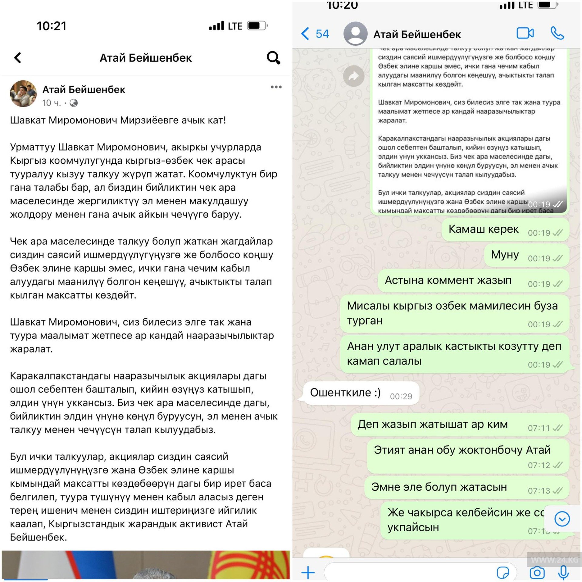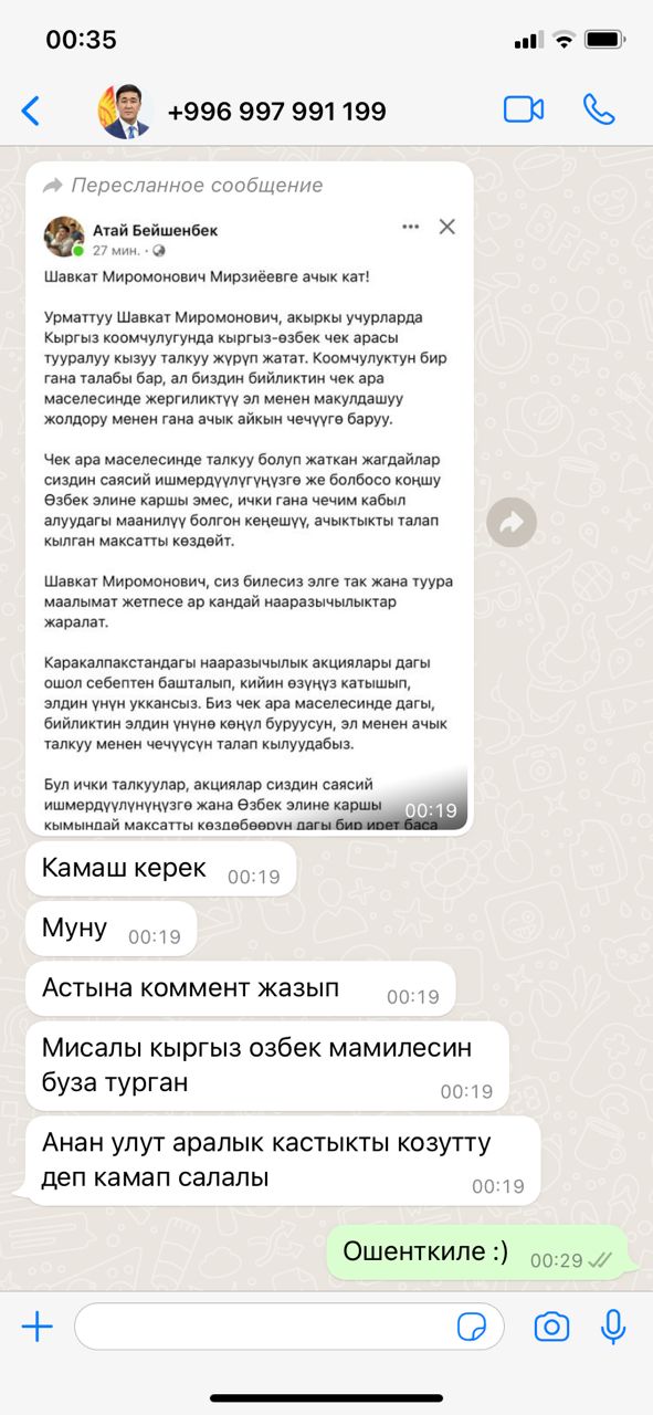 Из онлайн-беседы можно понять, что Дайырбек Орунбеков пересылает Атаю Бейшенбеку скриншот публикации активиста, где он обращается к главе Узбекистана Шавкату Мирзиееву по поводу кыргызско-узбекской границы.