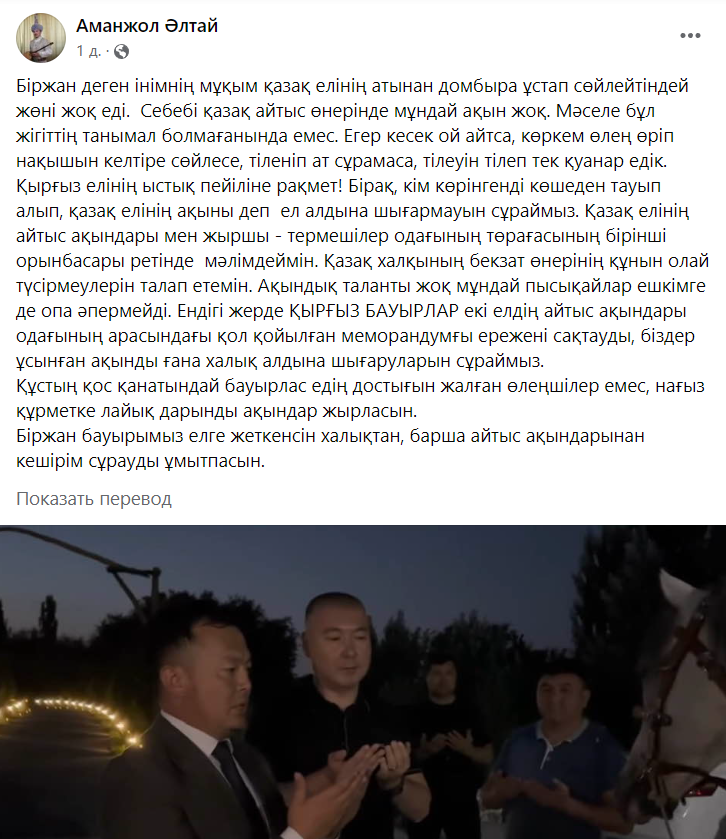 «У этого парня нет ни стыда ни совести. Он не должен был петь от имени казахского народа, взяв на руки домбру, потому что среди казахских поэтов-импровизаторов нет такого акына. И дело не в том, что он непопулярен. Если бы он хорошо исполнил, импровизировал, не просил подарок, то, конечно, мы бы его поддержали», — написал в Facebook Аманжол Алтаев.