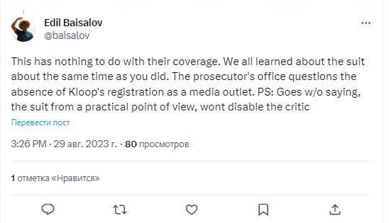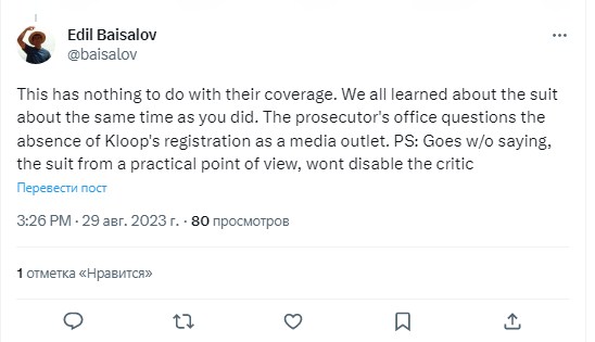 Инициатива прокуратуры города Бишкека о ликвидации общественного фонда Kloop.Media не имеет ничего общего с редакционной политикой сайта Kloop.kg. Об этом в cвоем X (бывший Twitter) написал заместитель председателя кабмина Эдиль Байсалов.