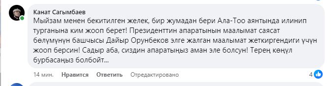 С обращением к главе ГКНБ Камчыбеку Ташиеву также выступил лидер партии «Социал-демократы» Темирлан Султанбеков на своей странице в Facebook. Он напомнил слова главы ГКНБ, когда спортсмены сказали, что будут выступать на соревнованиях со старым флагом. Тогда, напомним, Камчыбек Ташиев призвал всех соблюдать законы.