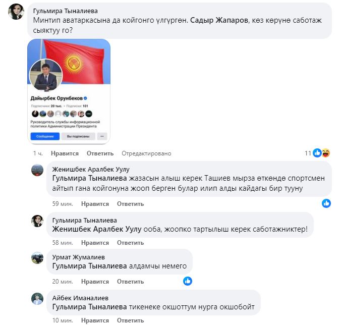 Об ответственности тех, кто ранее принял решение вывесить неправильный флаг, также написали в Facebook под фотографией, которой поделился президент КР Садыр Жапаров.