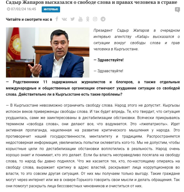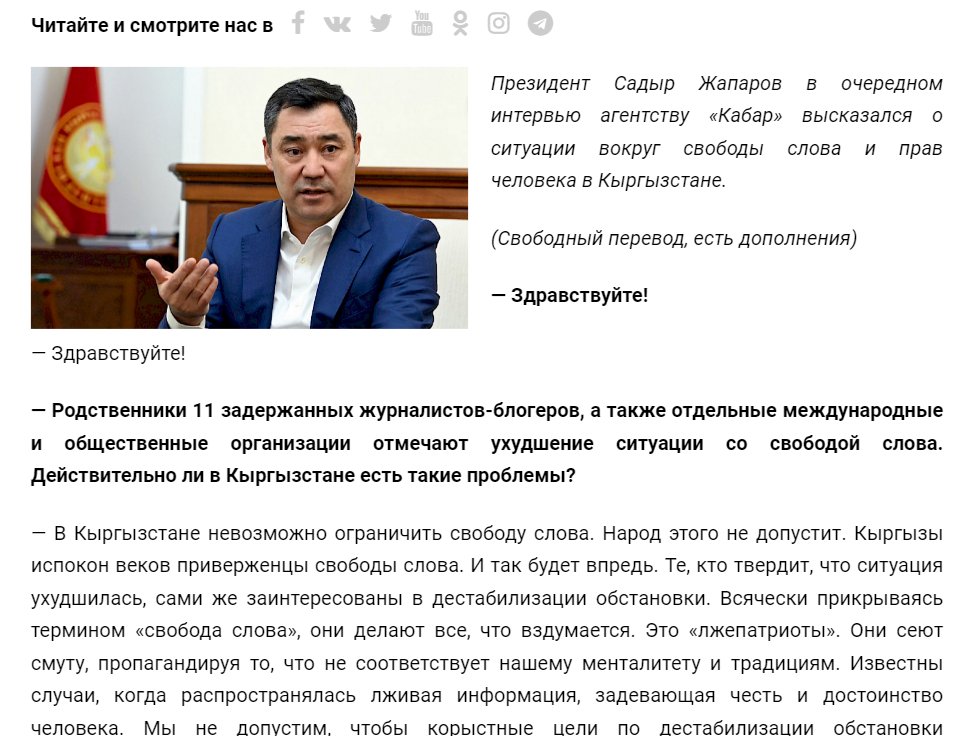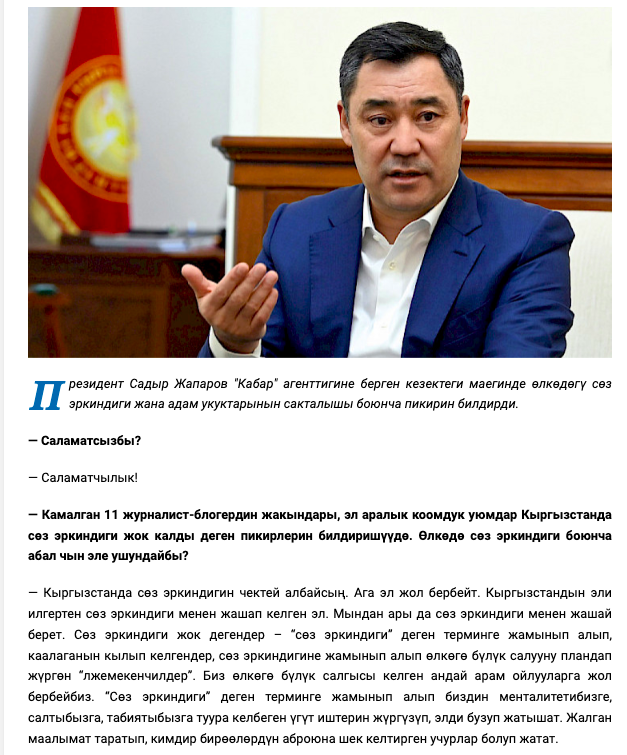 Напомним, сегодня в интервью государственному информационному агентству «Кабар» Садыр Жапаров прокомментировал свободу слова в стране и соблюдение прав человека.