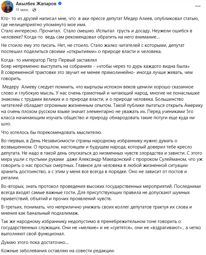 На критику Медера Алиева ответил сам Акылбек Жапаров. Он заявил, что статья написана на плохом русском языке и выглядит как неуважение к читателям: «Кто-то из друзей написал мне, что в СМИ депутат опубликовал материал, где нелицеприятно упомянуто мое имя. Прочитал — стало смешно, испытал грусть и досаду. Неужели ошибся в человеке?»