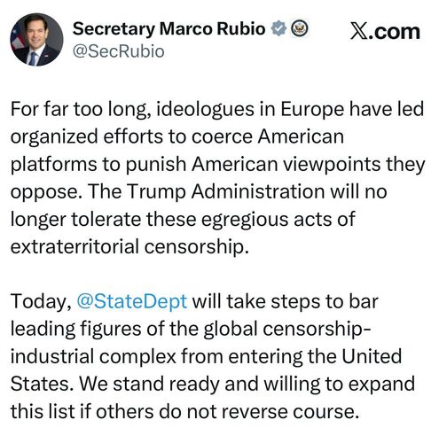 «Администрация Трампа больше не потерпит экстерриториальную цензуру», – заявил он. По его словам, речь идет о представителях так называемого глобального «цензурно-промышленного комплекса», оказывающих давление на технологические компании США.