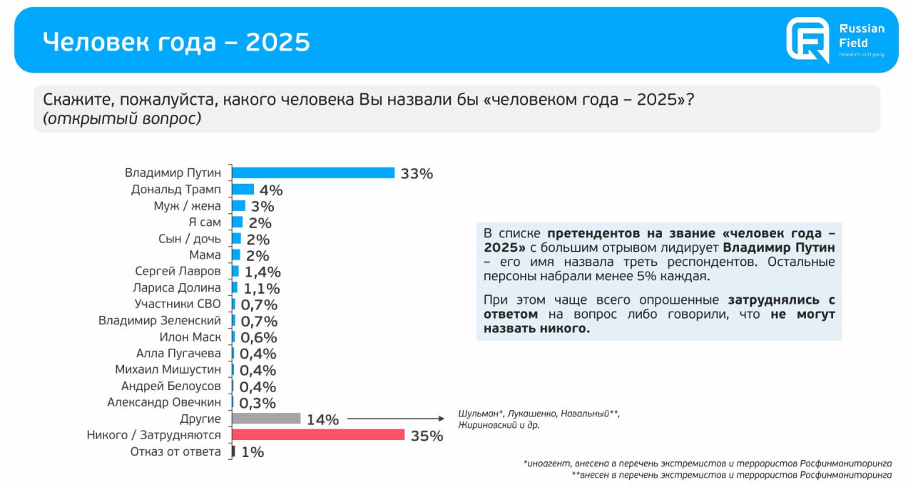 Согласно другому исследованию, треть опрошенных россиян (36 процентов) назвала «человека года — 2025» в политике президента РФ Владимира Путина. Такие данные получены в ходе опроса, проведенного фондом «Общественное мнение».