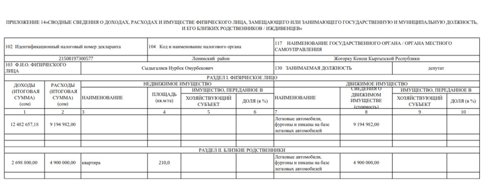 Доходы его близких родственников составили 2 миллиона 698 тысяч 800 сомов, расходы — 4 миллиона 900 тысяч сомов. За ними числятся квартира площадью 210 квадратных метров, а также легковые автомобили, фургоны и пикапы на базе легковых автомобилей.