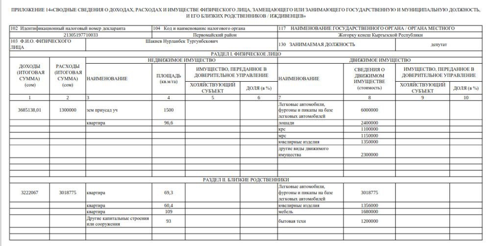 Декларация-2024. Торага ЖК владеет движимым имуществом на 6 миллионов сомов