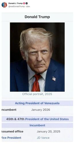 Американский лидер опубликовал скриншот якобы из «Википедии», в котором указано, что с января 2026 года он исполняет обязанности президента Боливарианской Республики. Также там указана и его настоящая должность — 47-й глава США.