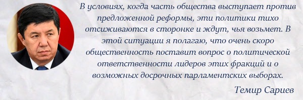«Что мы видим? Они (фракции ЖК) инициировали поправки, но сами и двух слов не сказали в их защиту. Ответственность за реформу фактически взял на себя президент. Такую позицию парламентских лидеров следует рассматривать либо как трусость, либо как безответственность перед обществом, либо вообще как своеобразную провокацию. Они подписались под проектом о внесении изменений, но не несут за это никакой ответственности», - резюмировал экс-премьер-министр КР.
