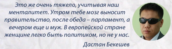 «То, что есть квоты для женщин, представителей разных национальностей и ЛОВЗ в ЖК – это хорошо, это некий социальный лифт. Но в будущем, я думаю, эти квоты должны уйти, когда наша страна станет экономически самостоятельной», - сказал Дастан Бекешев.
