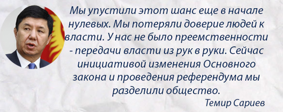 «Мы каждый раз меняли правила. Менялись принципы формирования институтов. Менялись полномочия госорганов. Мы не сумели наладить традиции органов управления. Мы не сумели привить культуру власти. Мы до сих пор в поиске. Каждый, кто приходит, пытается менять Конституцию, становятся инициаторами изменения тех или иных процессов», - подчеркнул Темир Сариев.