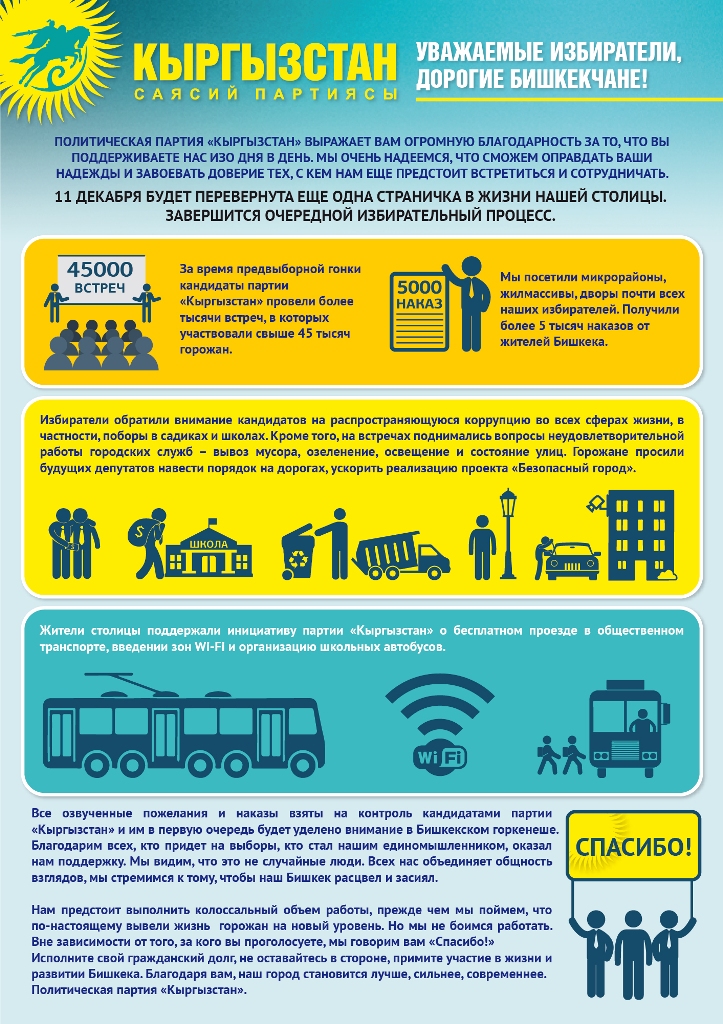 Политическая партия «Кыргызстан» выражает вам огромную благодарность за то, что вы поддерживаете нас изо дня в день. Мы очень надеемся, что сможем оправдать ваши надежды и завоевать доверие тех, с кем нам еще предстоит встретиться и сотрудничать. 11 декабря будет перевернута еще одна страничка в жизни нашей столицы. Завершится очередной избирательный процесс.