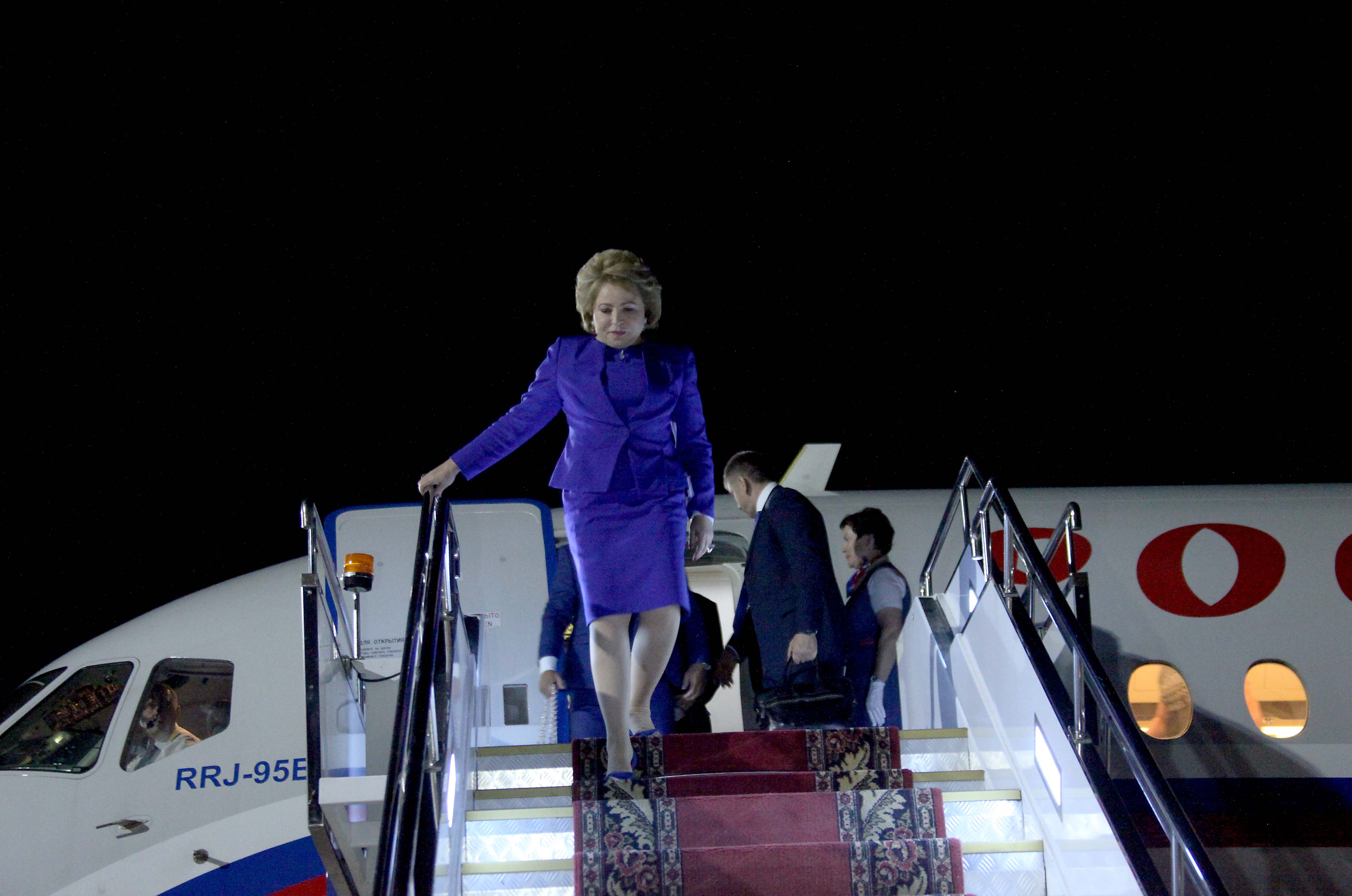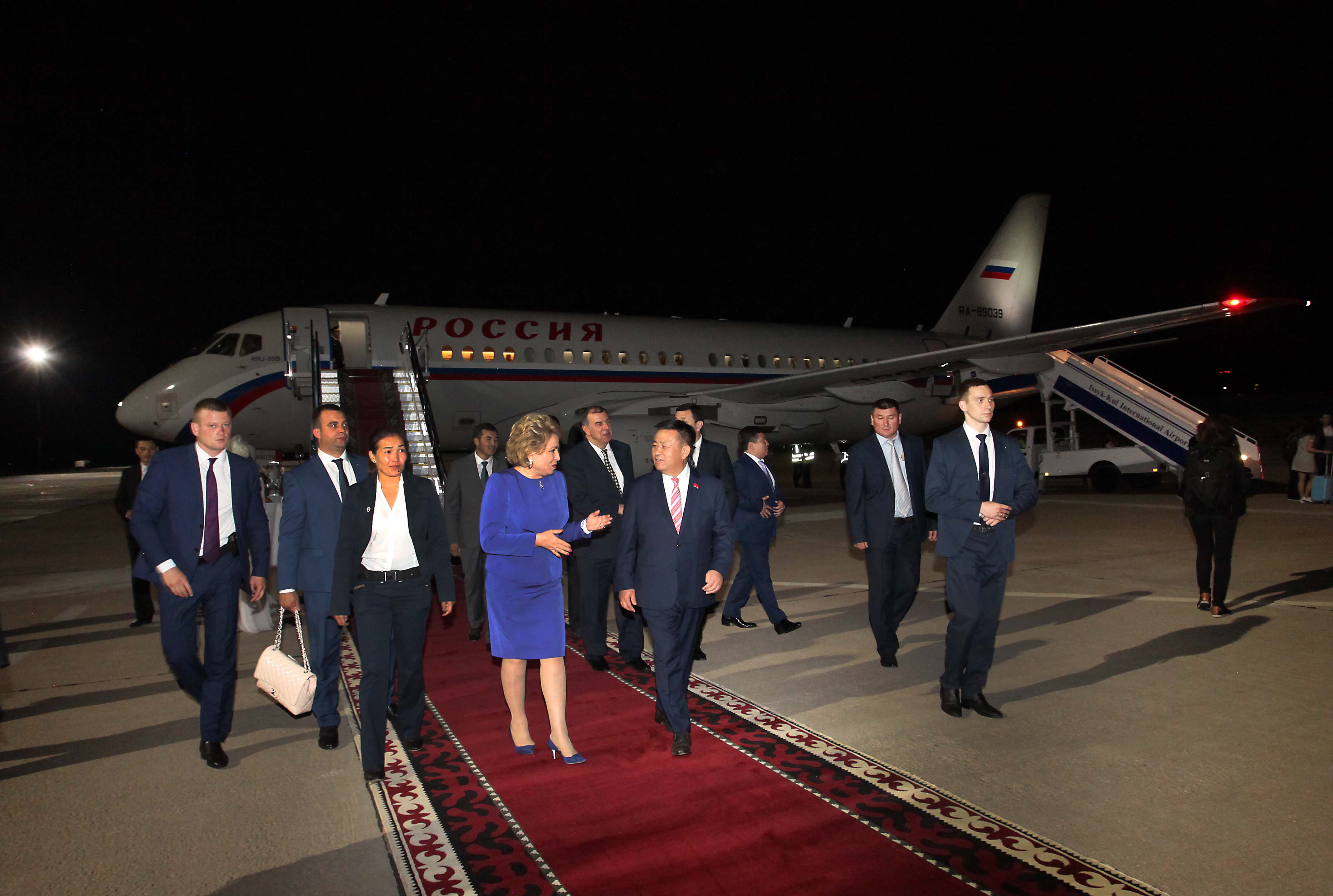 Председатель Совета Федерации России Валентина Матвиенко после встречи с президентом Кыргызстана прилетела в Иссык-Кульскую область. Гостью в международном аэропорту «Иссык-Куль» («Тамчи») встречал торага Жогорку Кенеша Чыныбай Турсунбеков.