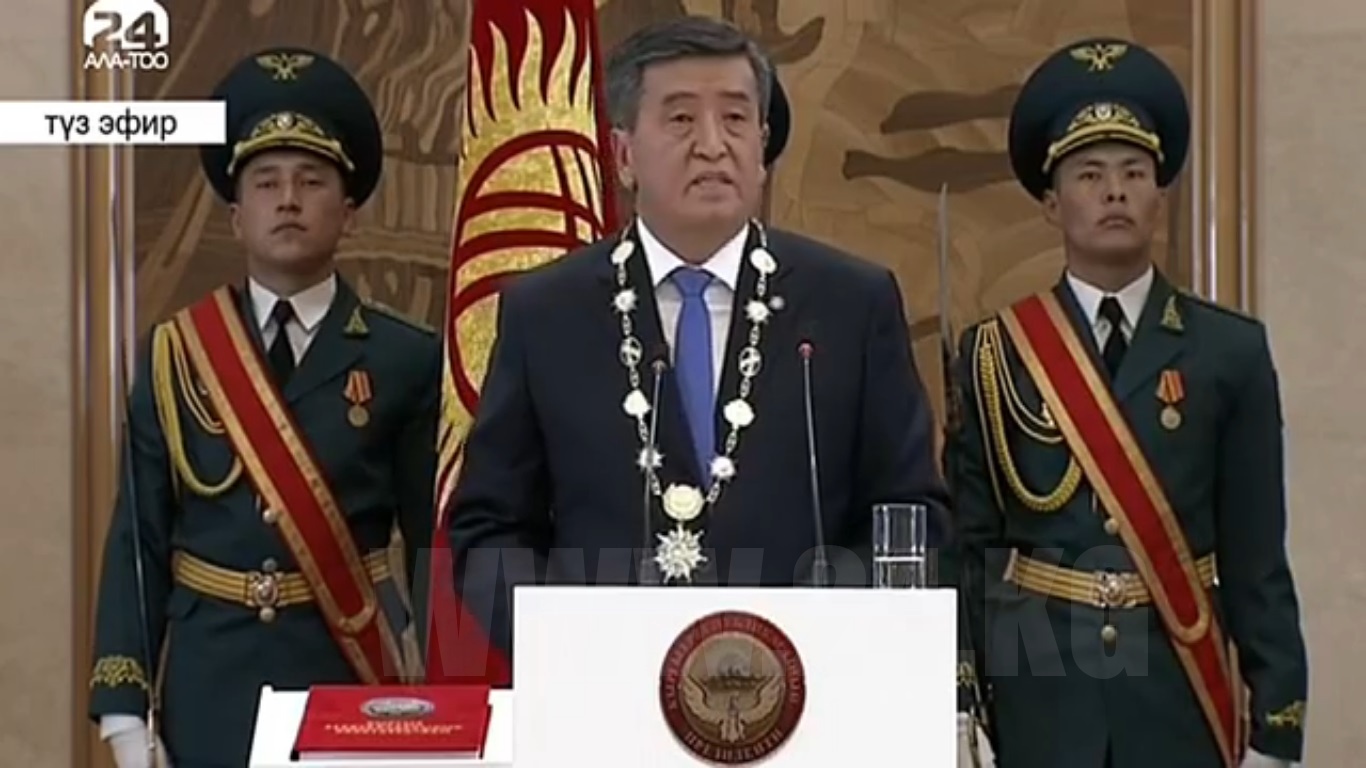 Председатель Центризбиркома КР Нуржан Шайлдабекова вручила ему удостоверение, нагрудный знак и штандарт главы государства. С этого момента Сооронбай Жээнбеков считается официально вступившим в должность президента. Он был выбран 15 октября: за него проголосовали 54,77 процента избирателей.