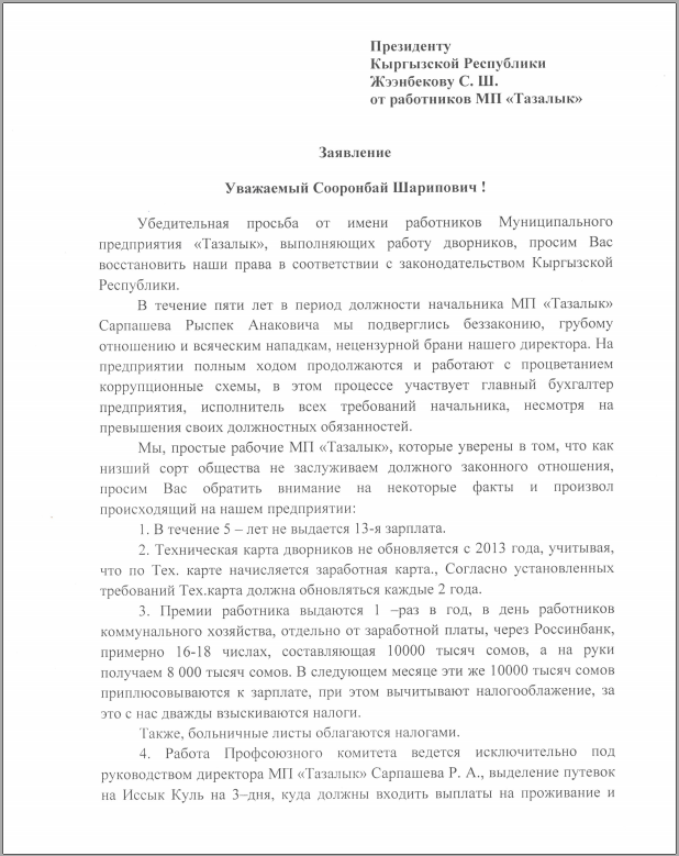 Работники столичного муниципального предприятия «Тазалык» направили открытое обращение президенту Кыргызстана, жалуясь на Рысбека Сарпашева. Напомним, накануне он был представлен аппарату мэрии в качестве нового вице-мэра столицы.
