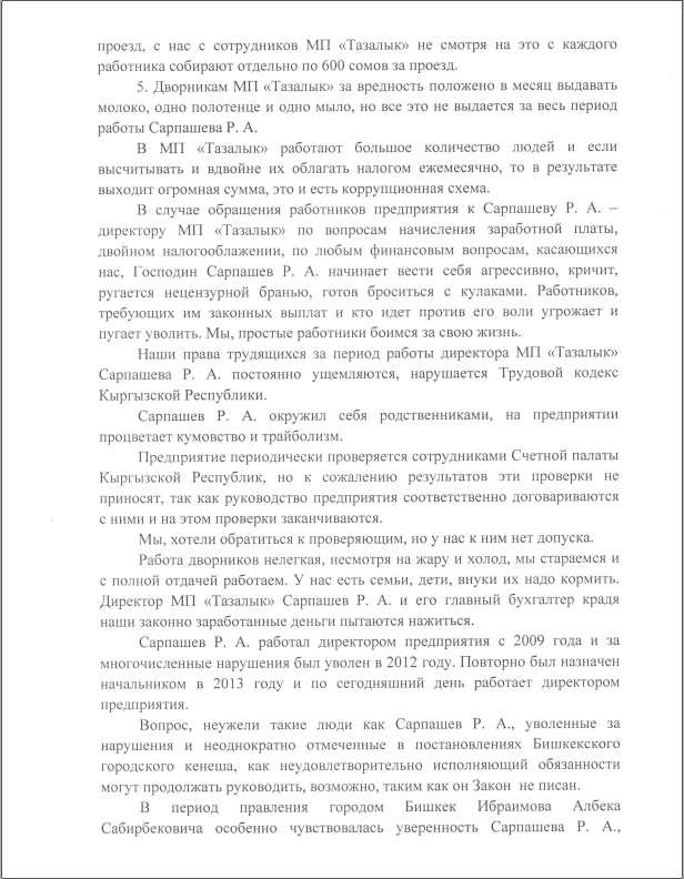 «Рысбек Сарпашев работал директором предприятия с 2009 года и за многочисленные нарушения был уволен в 2010 году. Неужели такие люди, уволенные за плохо выполненную работу и не раз отмеченные на сессиях горкенеша, могут продолжать руководить? В период правления городом Албеком Ибраимовым Сарпашев особенно чувствовал свою уверенность, несмотря на то что БГК не раз признавал его работу неудовлетворительной», — говорится в обращении на имя Сооронбая Жээнбекова.