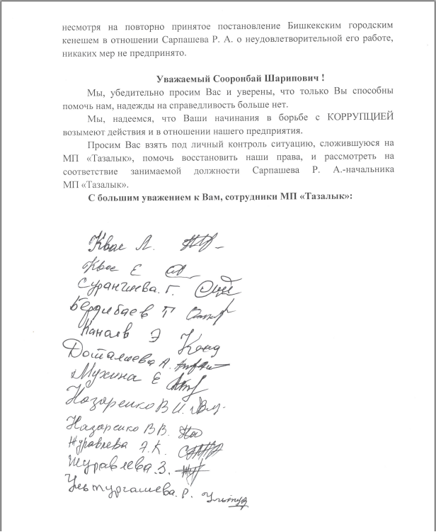 Авторы письма отмечают, что в период руководства Рысбека Сарпашева подвергались беззаконию, грубому отношению и всяческим нападкам, а также нецензурной брани с его стороны.