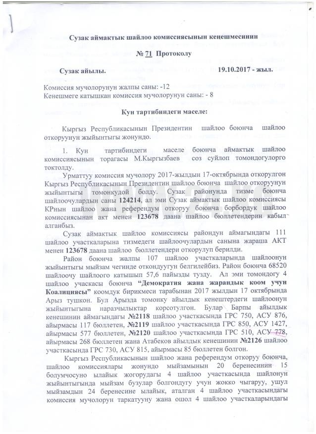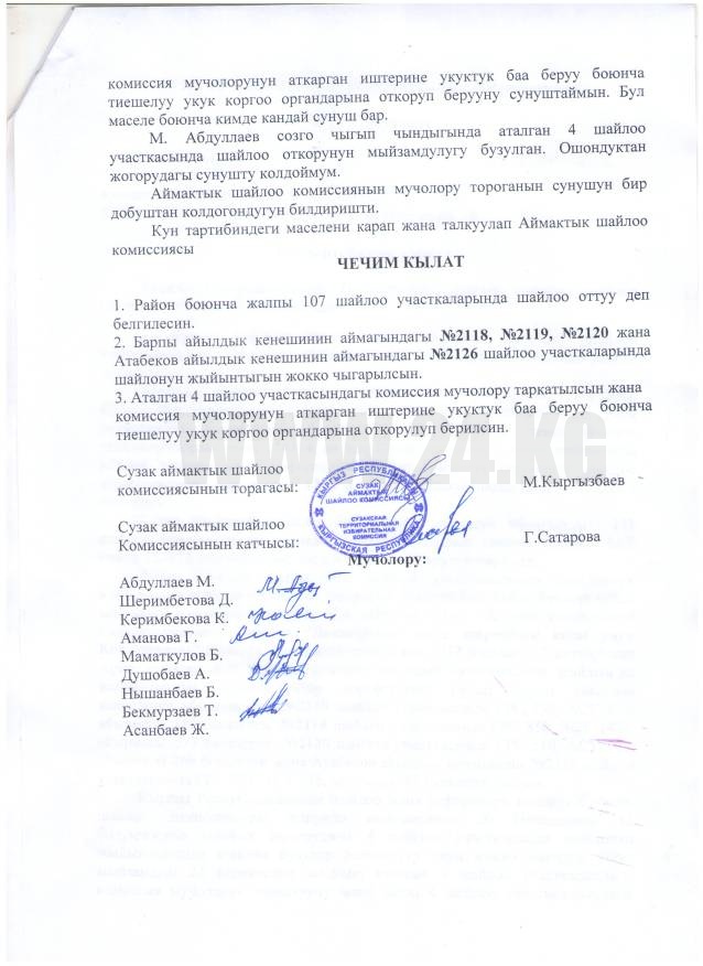 «Оказывается, во время голосования на некоторых участках была нарушена процедура голосования. Дело в том, что в законе говорится: избиратель, получив чек об идентификации, должен обменять его на бюллетень. В этом и есть несовпадение. Сегодня-завтра остальные ТИКи будут рассматривать все заявления и обращения граждан по нарушениям на выборах, и на основании протоколов ТИКи будут подводить итоги голосования на своей территории и выносить решения», — ответил Абдыжапар Бекматов на вопрос корреспондента, на каких ТИК еще аннулированы итоги голосования.