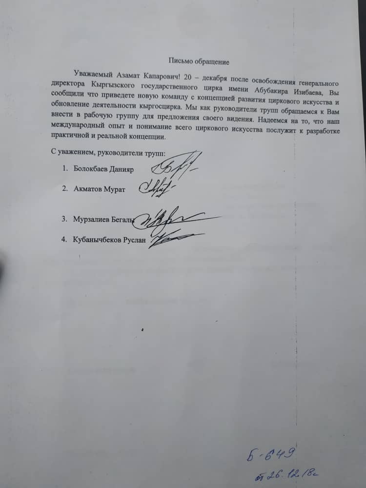 Руководители трупп Кыргызского государственного цирка имени А.Изибаева просят включить их в группу по разработке концепции развития учреждения. С таким требованием они обратились в письме на имя министра культуры, информации и туризма Азамата Жаманкулова.